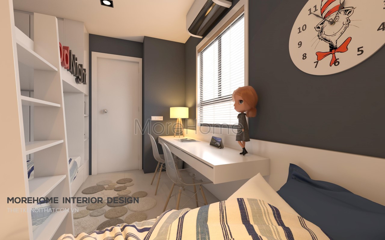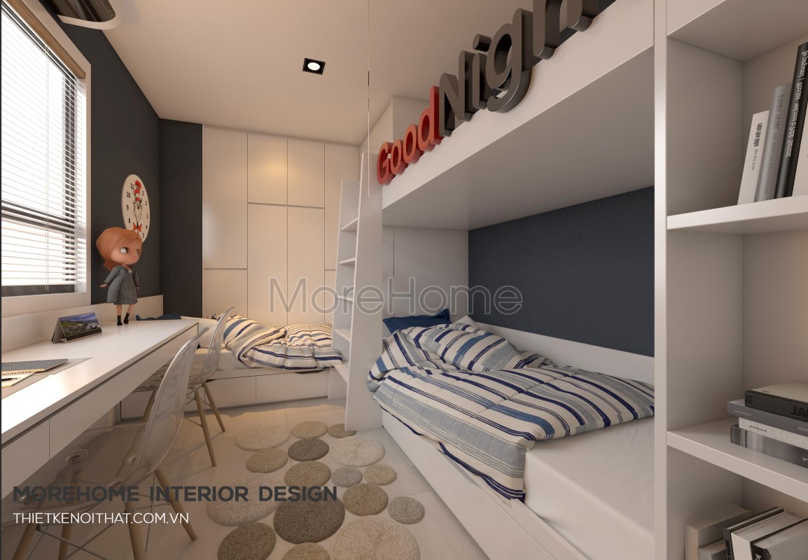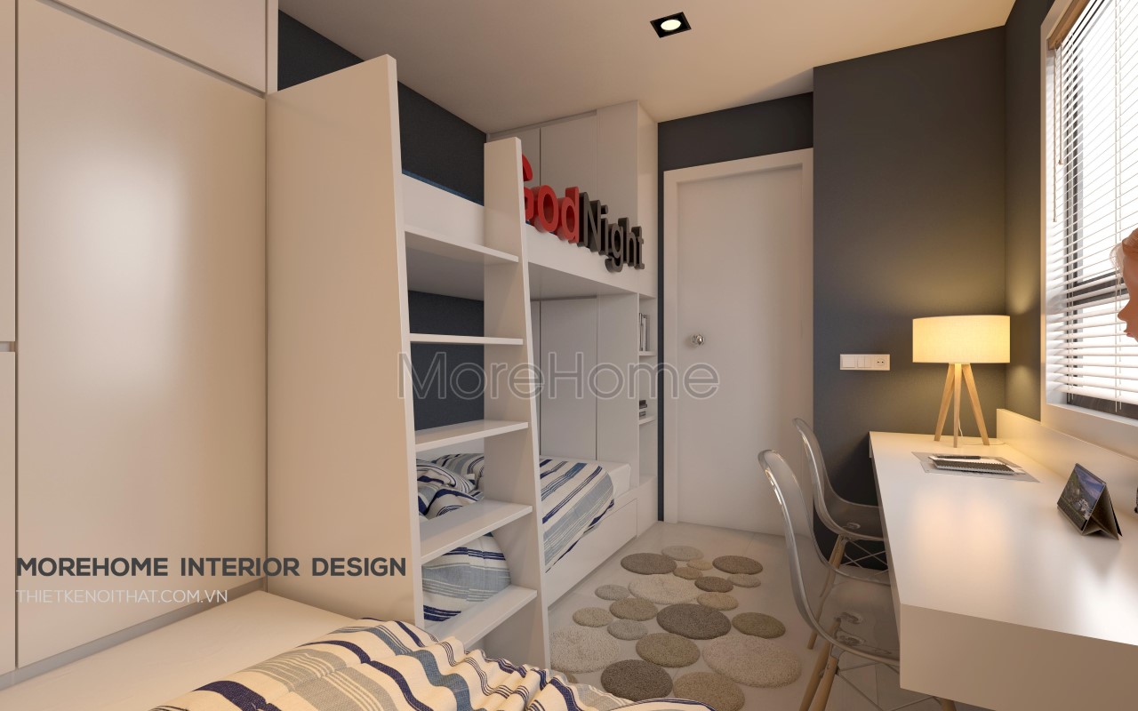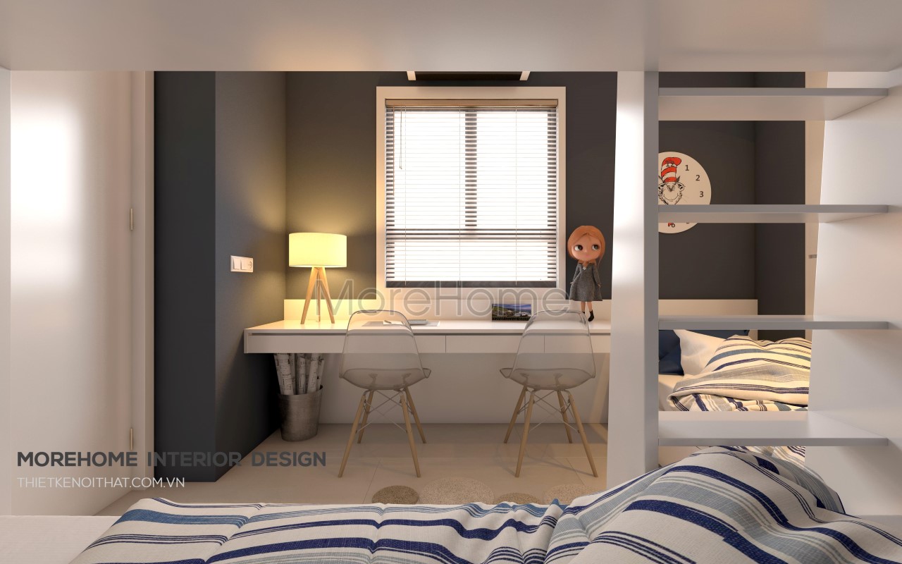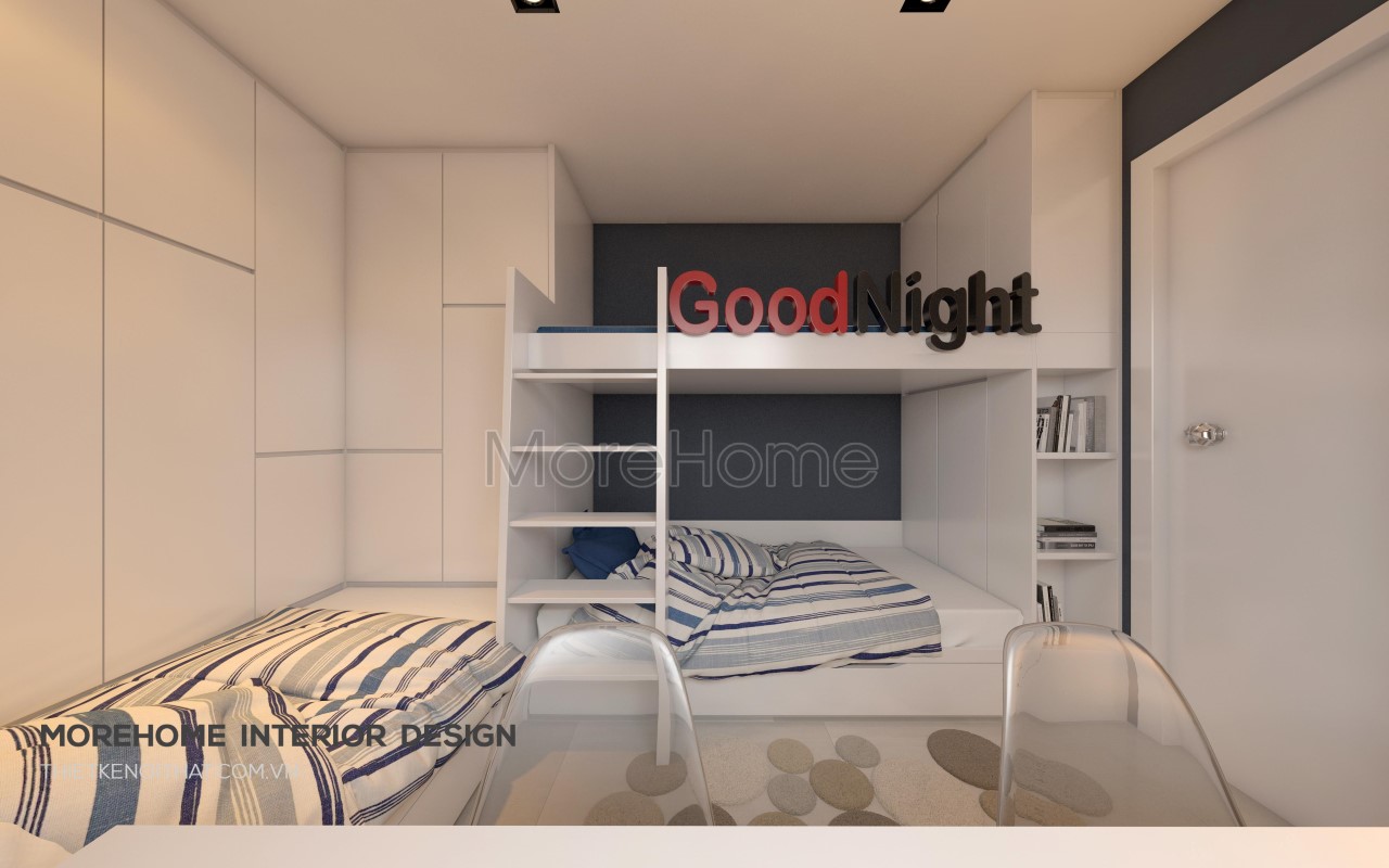 Tiếp đến là thiết kế nội thất phòng ngủ cho trẻ, hai tone màu xanh lam trầm và trắng được kết hợp nhẹ nhàng mang đến vẻ đẹp khỏe khoắn và năng động. Thiết kế giường khá đặc biệt, kết hợp khéo léo giữa nơi nghỉ ngơi và nơi thư giãn, đọc sách là một ý tưởng không tồi giúp tiết kiệm một lượng lớn không gian.
