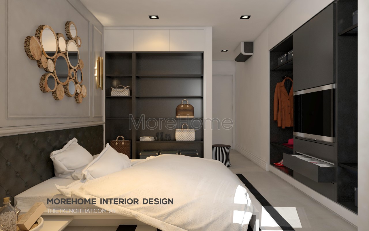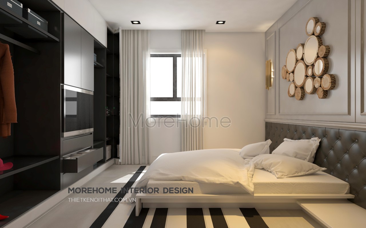 Với thiết kế nội thất phòng ngủ Master phong cách hiện đại, kiến trúc sư ưu tiên sử dụng vật liệu nhẹ là gỗ tự nhiên để tạo điểm nhấn. Bên cạnh đó, các thiết kế kệ tủ đa năng được thiết kế âm tường tiết kiệm tối đa không gian, tạo độ thoáng cho căn phòng.