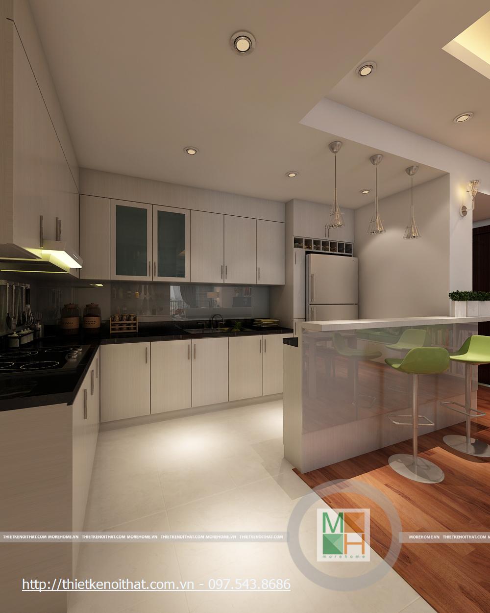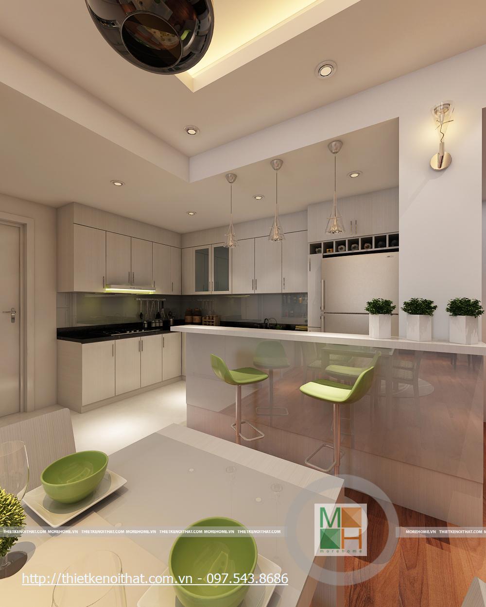 Thiết kế nôi thất bếp hiện đại chung cư Mipec được khéo léo quây gọn thành một khu riêng biệt mang đến sự gọn gàng và sạch sẽ. Tủ bếp to rộng với thiết kế đa ngăn tiện dụng giúp không gian trở nên ngăn nắp, tiện dụng cho gia chủ. Thiết kế liền mạch từ bàn ăn vào bếp tạo sự cân bằng và đồng nhất với các điểm nhấn nhẹ nhàng như chi tiết ánh kim loại từ đèn bàn ăn hay chậu cây trang trí nhỏ mang sắc xanh vào căn bếp.