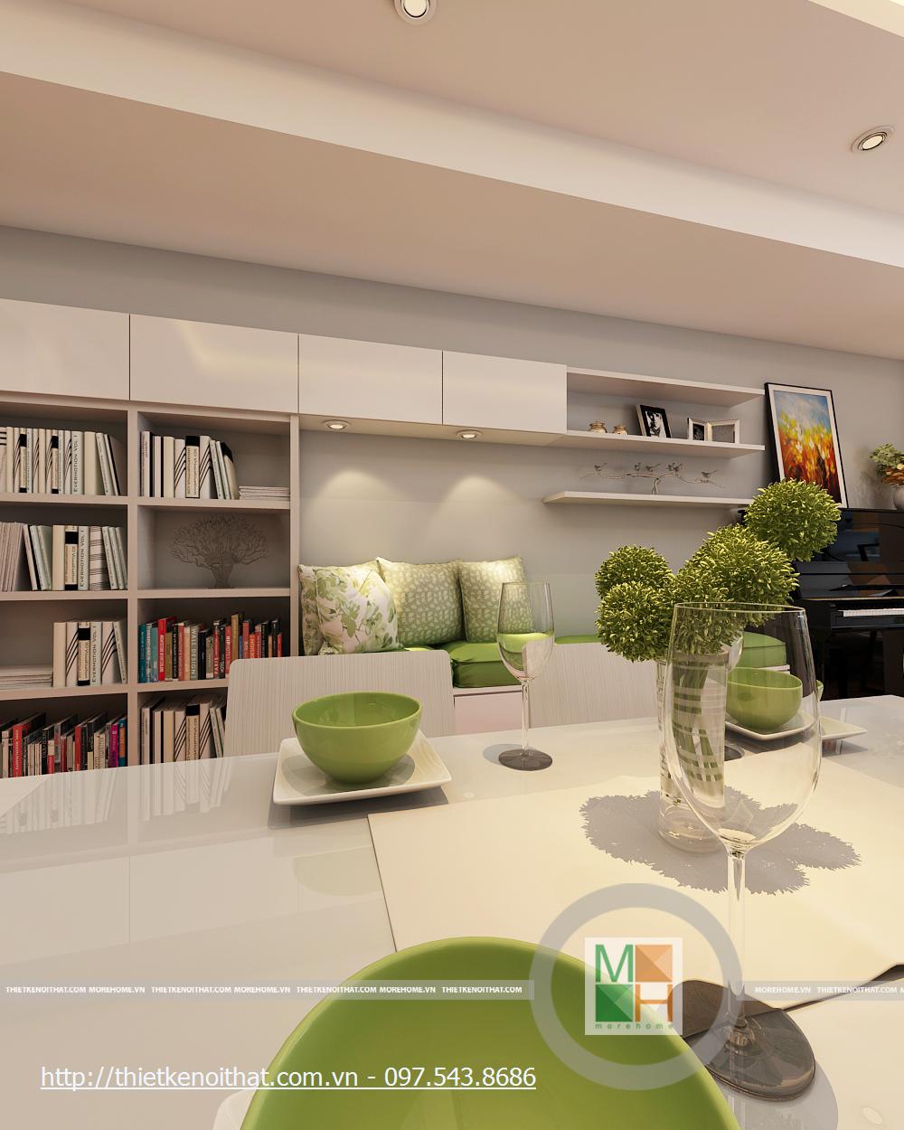 Tiếp đến là thiết kế không gian chung cho bàn ăn và phòng bếp. Thiết kế nội thất chung cư hiện đại có diện tích không quá lớn vì vậy các vách ngăn không cần thiết được cắt bỏ giúp tăng độ mở và thoáng cho công trình. Thiết kế bàn ăn hiện đại với tone màu trắng theo phòng cách tối giản khá nhẹ nhàng và đồng nhất với các thiết kế kệ tủ cho của căn hộ. Một điểm nhấn khác lạ của căn hộ chính là thiết kế kệ sách kết hợp không gian đọc sách thư giãn. Theo đúng sở thích và thói quen của gia chủ, không gian đọc được lồng ghép khéo léo ngay trong khu sinh hoạt chung mang đến cảm giác gần gũi và thư giãn. Với điều kiện thiết kế nhà chung cư không quá rộng, đây thực sự là một sự kết hợp khá ấn tường vừa đảm bảo công năng khu sinh hoạt chung lại đáp ứng sở thích của gia chủ.