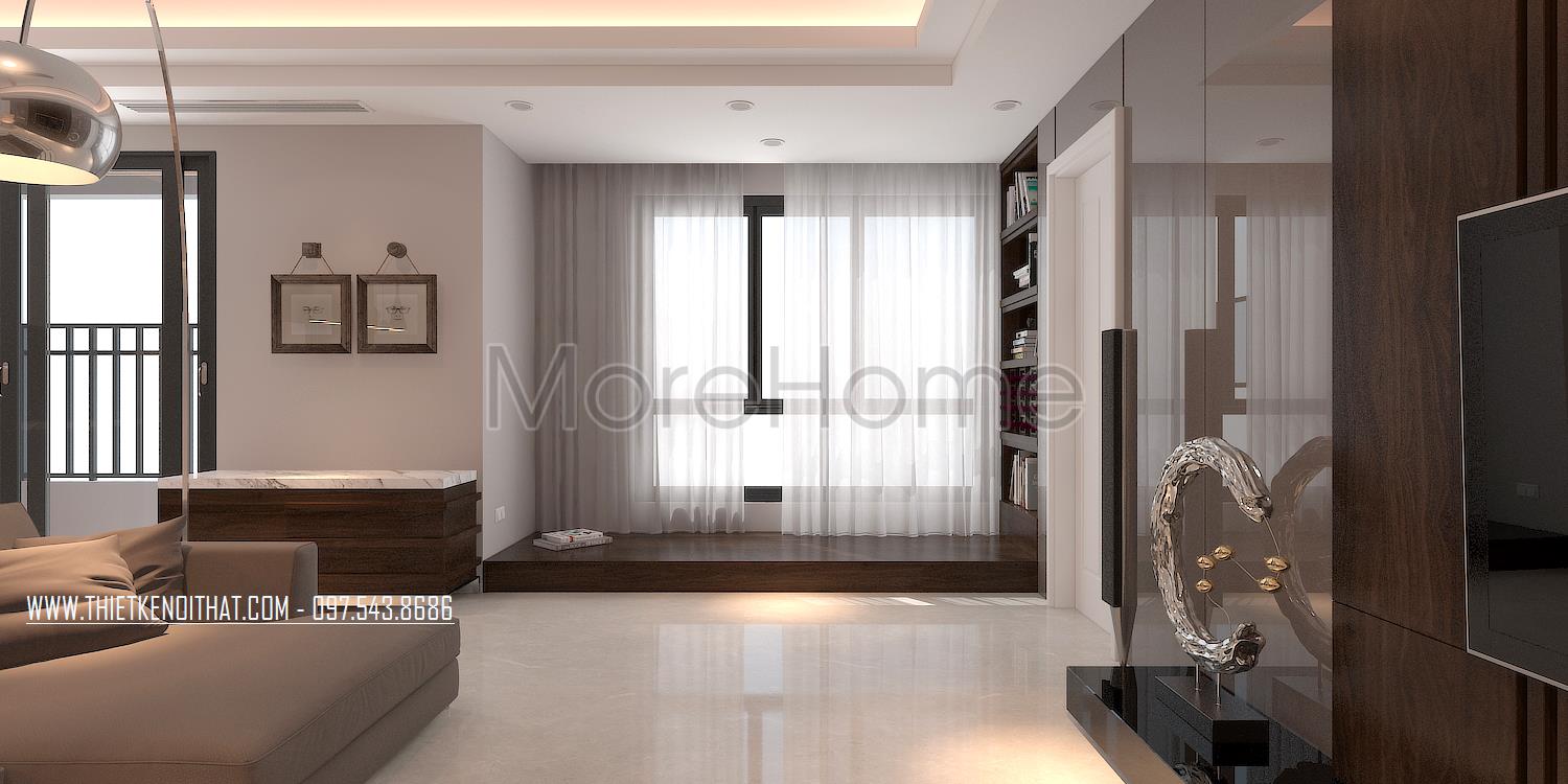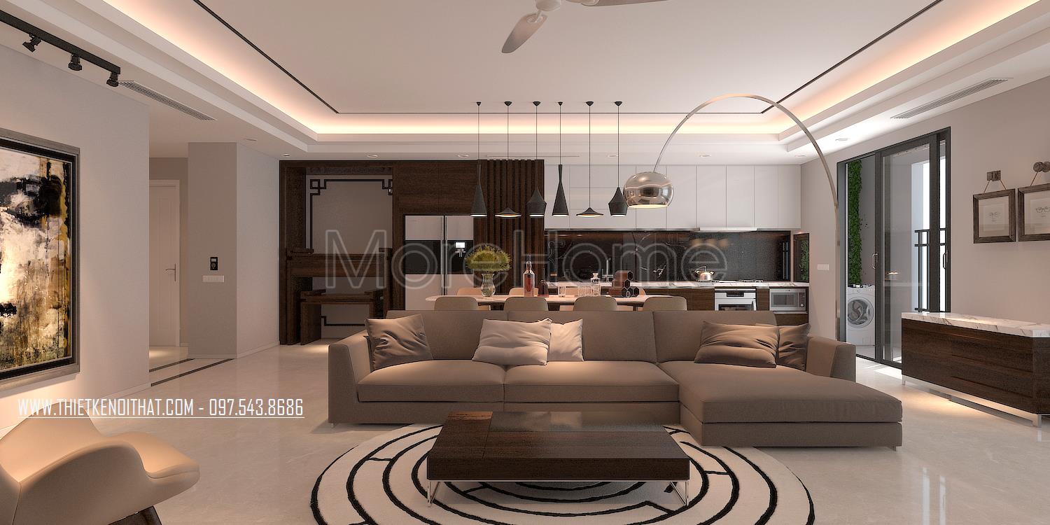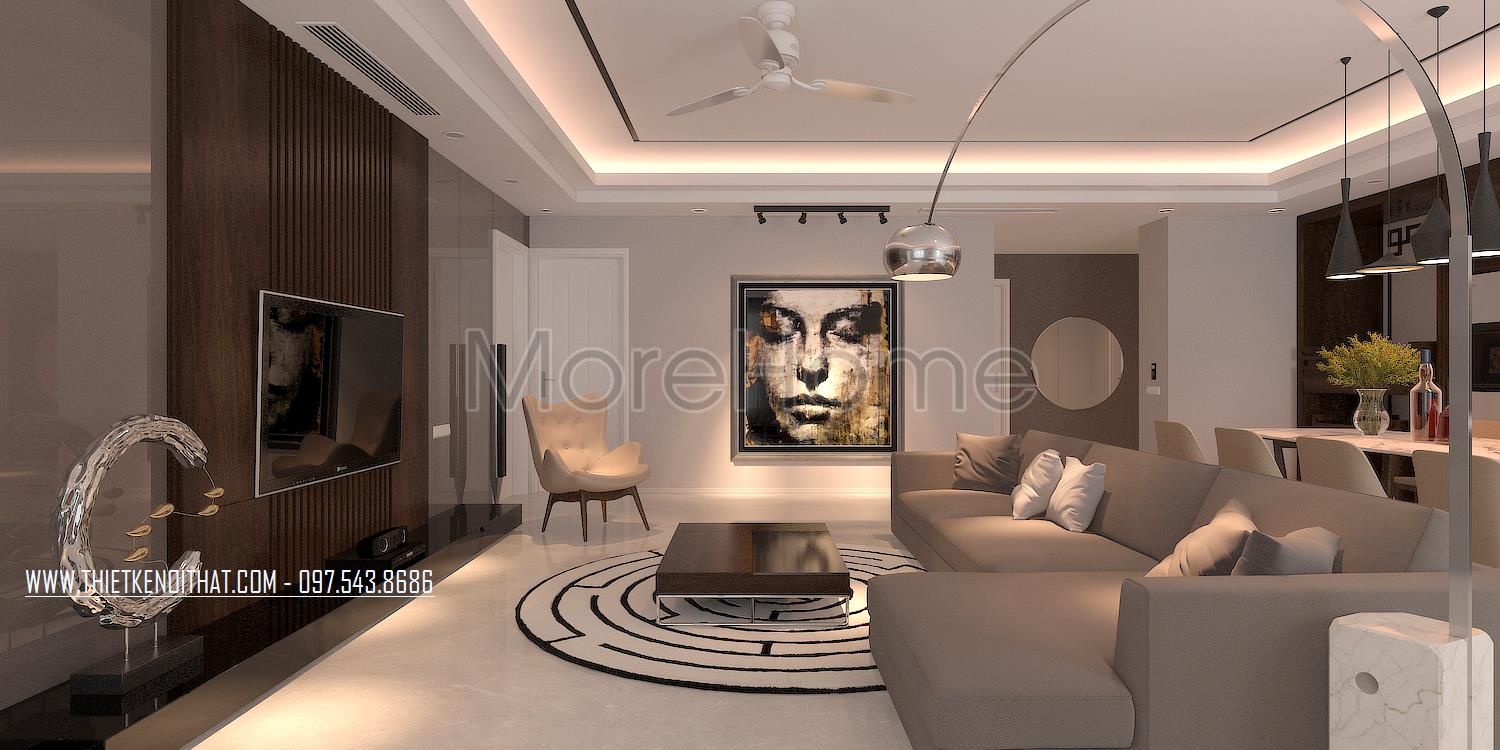 Thiết kế nội thất phòng khách hiện đại sử dụng các tone màu lạnh cơ bản mang đến cảm giác trẻ trung và hiện đại. Ghế sofa to rộng thiết kế dạng chữ L mang lại cảm giác vững chãi và an toàn cho căn phòng. Một điểm yếu cả căn phòng chính là tone màu ghi mang có phần mang đến sự đơn điệu và đơn giản, để tránh cảm giác này mà mang lại sự cân bằng cho không gian cũng như đường nét, kiến trúc sư đã khéo léo thiết kế mảng tường khác biệt với thanh gỗ xếp dọc tone màu nâu trầm mang đến sự ấm áp, tạo ấn tượng về sự sáng tạo và phá cách.